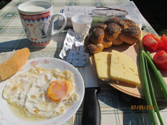 Ostanek poprove omake od včerajšnjih biftekov, v omako sem tunkala svežo lepinjo iz bližnje lekarne, potem pa kos lepinje z maslom z grobo morsko soljo. Idealen zajtrk zame. Pol pa kava preko, in zdaj še ena.