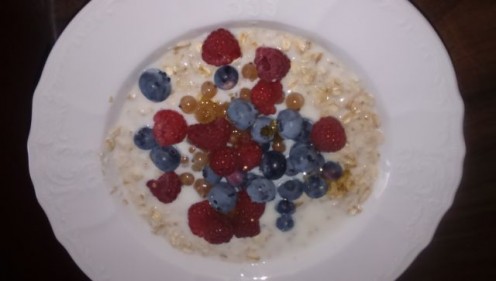 Ovseni kosmiči, med, mleko, beli ribez, ameriške borovnice in maline. Te tri stvari z domačega vrta.