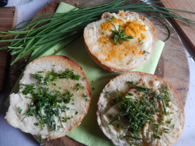 Popečene kajzerce, maslo, drobnjak, kurkuma, muškatni orešček in voda s polovico limete.