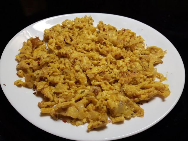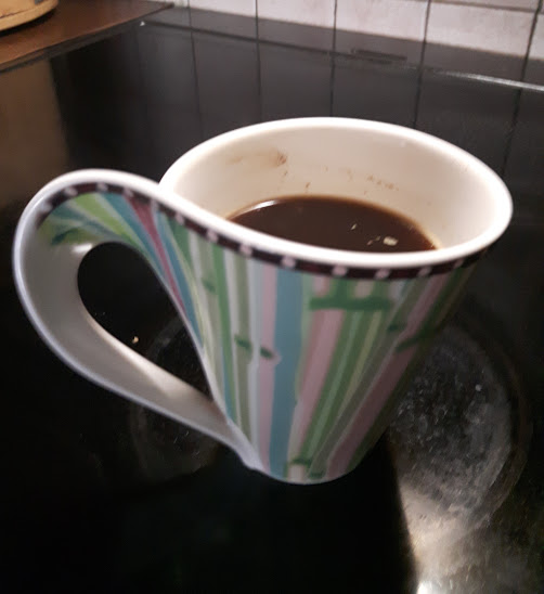 Danes čisti užitek: stepena jajca z začimbami (poper, dimljena paprika, origano, malo kurkume), pečena na čebuli in zaseki. Čisti užitek. In potem skodelica kave.