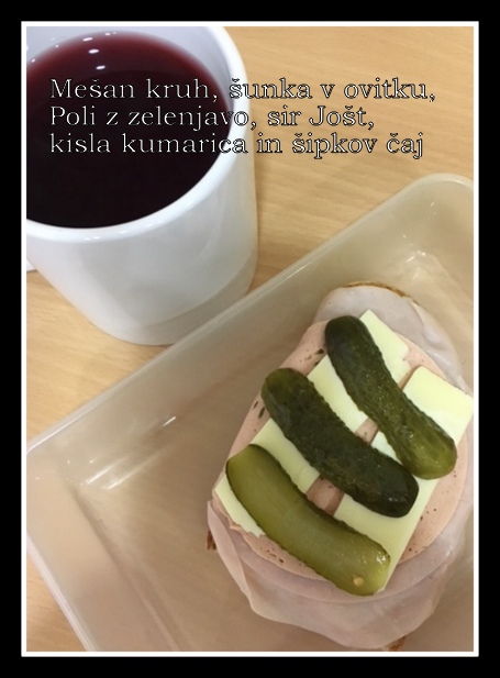 Danes sin doma( ker se je nalezel mojih bacilov) kruh z jagodno marmelado, čaj iz gozdnih sadežev, jaz pa planinski čaj in kruh s sirnim namazom