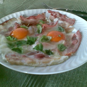 Pečena jajca na oko s slanino in svežo baziliko, kruh, mleko in bela kava (tile dve pijači nista na sliki, ker nista tako fotogenični