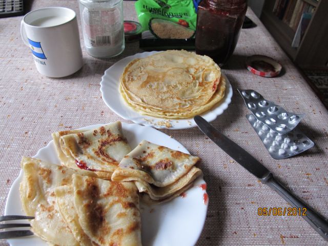 Že ob osmih sem si delala sirove hrenovke z jajčko na oko, zraven kečap, kruh z maslom in čemažem in čaj.