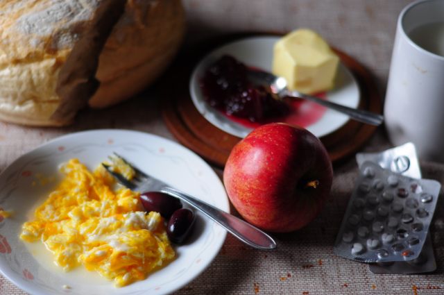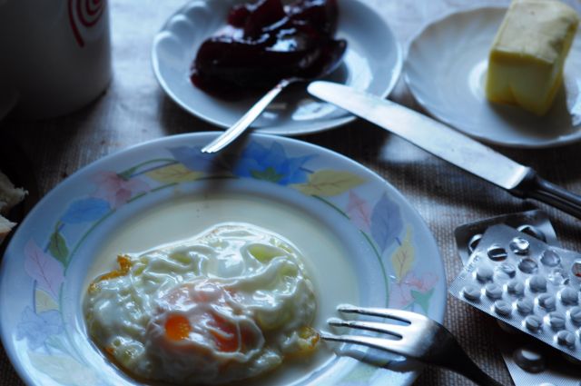 @brando: jajce na oko, v drugi vrsti, skrajno levo se vidi del skodelice s mlekom, krožniček s žličko je marmelada ( kozarec je skor prazen, pa sem dal na krožniček, da se lažje dobi, desno, na drugem krožničku, je maslo.