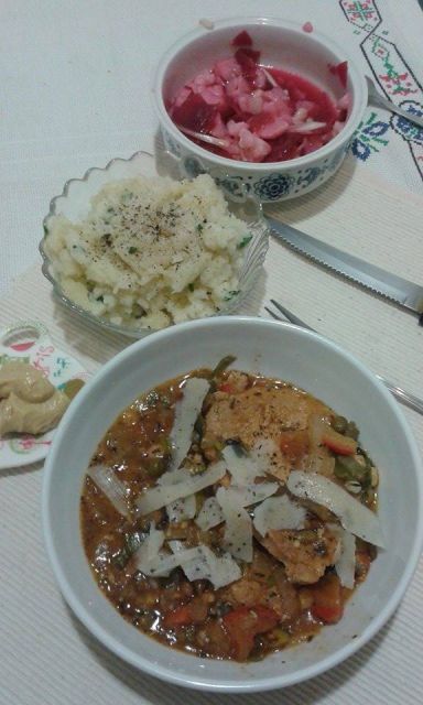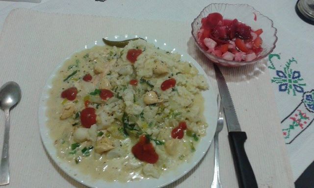 Večerja in frištek posvečen njemu. Ker sem ga zvečer preveč uničil, sem maščobe dodal v obliki zelenjavne smetanove omakice. Je v stekleni šalčki. Solata pa je bila iz kitajskega zelja, kumarice in včeraj nabranega čemaža.![]()
