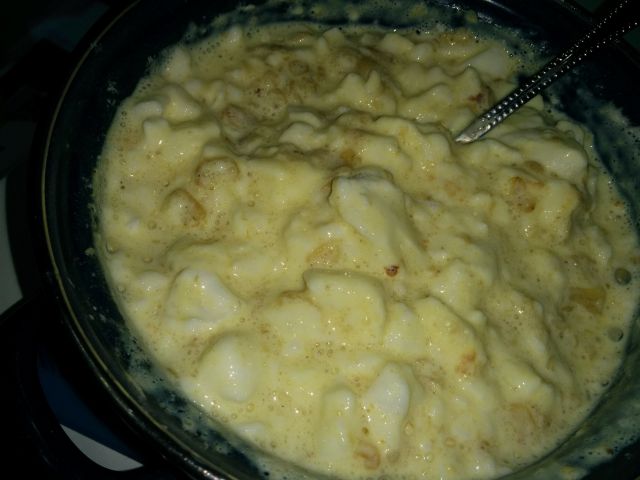 V malo mleka sem dodala rumenjak, droben ščep soli ter ravrela. Med čakanjem, da zavre, sem zmiksala beljak. V mleko sem dala ovsene kosmiče in kuhala cca. dve do tri minute (skoraj ves čas mešala), nato pa po žlicah dodajala stepen beljak ter med počasnim mešanjem kuhala še toliko, da je beljak kuhan, cca dve minuti.