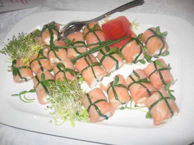 - zvitki iz pršuta (rezine pršuta s tanko plastjo skute, okrašeno z olivo ali grozdno jagodo in sirom)