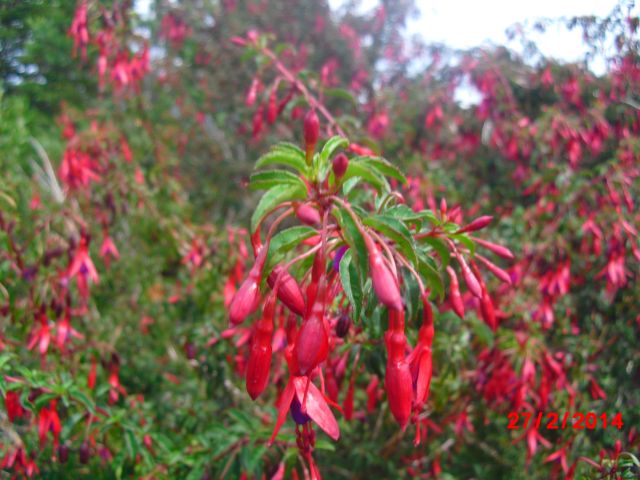 Jeeeeeeeeeeeeeeeeeeeeeeeeeeeee, ežoj, vidiš, kuj in prec in takoj je pomagalo, da si našel nekja avtohtonega, samo, da se je mal Darwin vmešal (Charlews, čeprav bi tudi Erazem, njegov ded, bil uporaben). Ja, nakverjetneje je to Fuchsia magellanica, avtohtona v onih koncih, kjer si zdaj. Citiram vseznalko Wiki: is species of Fuchsia occurs in temperate climate southern regions of Argentina and Chile, from latitude 32°50' S. to the Straits of Magellan.