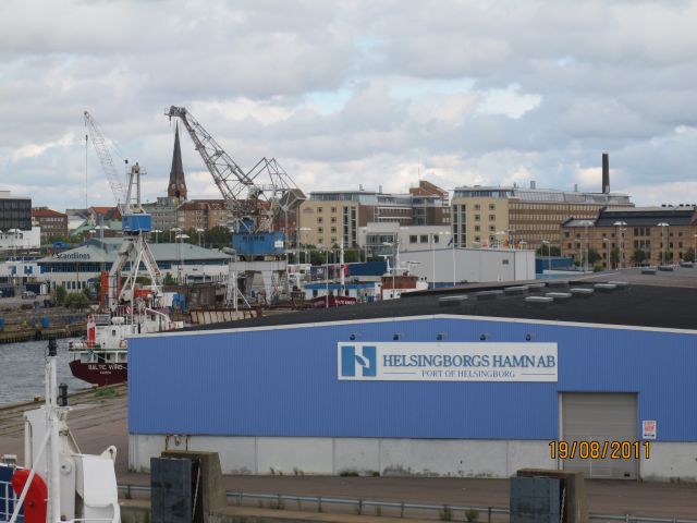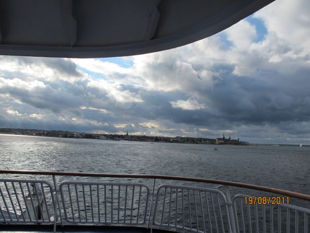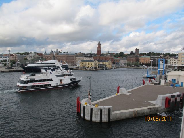 Seveda je samo ena prava smer, na jug, a ne na sever, kot sem jaz zavil, prisežem pa, da na onem križišču, na katerem sem jaz zavil, ni bilo nobene oznake ali gre za sever ali jug. Po nekaj nepotrebno prevoženih kilometrov in popravilo napake se je vlilo kot iz škafa in je lilo skos do pred Helsinborgom, kjer sem se namenil s trajektom na Dansko, pa to mesto nisem izbral zaradi tega, ker bi bil most O( z onimi pikicami )resund manj atraktiven od mostu čez potok pri železniški postaji pri naši vasi ( pri prehoda mostu Oresund se pravzaprav ne vidi čisto nič, kot bi se peljal po avtocesti, nobene višine, nobene impozantnosti ). Sledi vkrcanje na ladjo, in nekaj posnetkov s ladje: