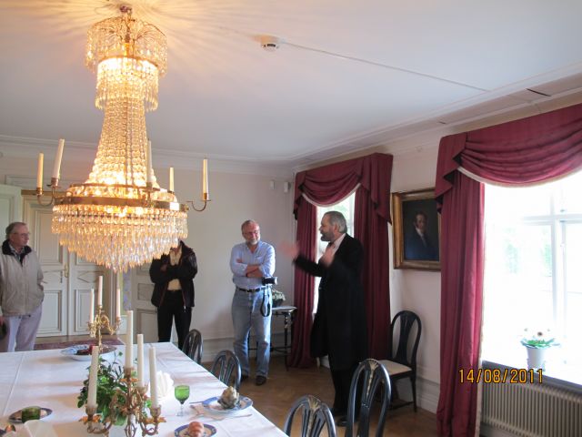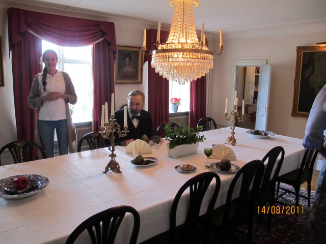 Ogled ( vodeni s angleško govorečim vodičem ) stane 100 kruna ( 10 € ). Vstopimo v jedilnico, kjer je včasih A. Nobel obedoval. Videti je bilo ( spodnja slika ) mizo s nekakšno zelenjavo na krožnikih in lutko A. Nobla. Na sliki je vodička.