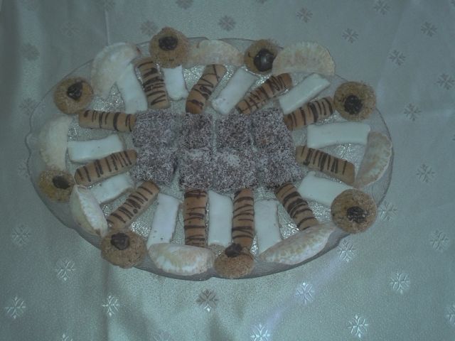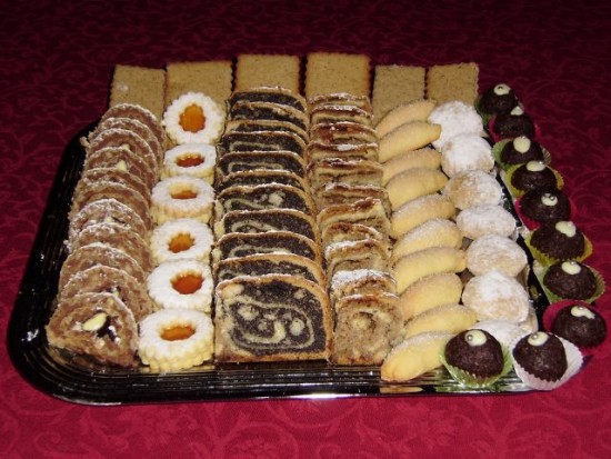 Čokoladne bananice v oblatnih, marmeladni kranjclji (z eno luknjico), krhka makovka, krhka orehovka, limunčki, šape, spekulasi, mozart kroglice.