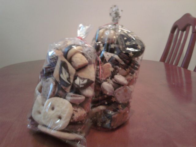 Lani sem v času božične peke napekla kar nekaj piškotov (med njimi so bili medenjaki, mehki cimetovi keksi, istrski cukarini, cimetove zvezdice,...) in jih spakirala v darilne vrečke, ki smo jih potem razdajali okrog.
