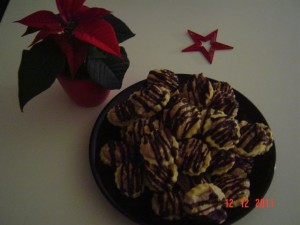 Peka se nadaljuje... Lešnikovi huzarski krapki in piškotki z aromo pomaranče in orehovo peno načičkani s čokolado.![]()
