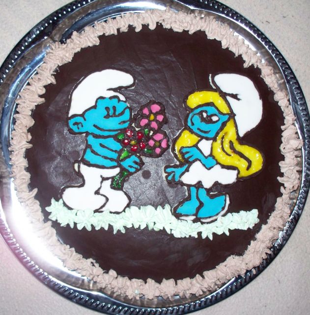 z modro barvo v tubi od dr.oetkerja sem zelo zadovoljna...samo par kapljic sem dala v sladkorno glazuro in se je precej močno obarvalo. Smrkca sem izrezala iz ponarejene domače tičine mase (recept s tega foruma) in nnato risala na to maso z obarvano sladkorno glazuro-razen rjava barva je stopljena jeidlna čokolada:), pa tudi podlaga je čokoladna in ob robu smetana s čokolado:)