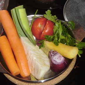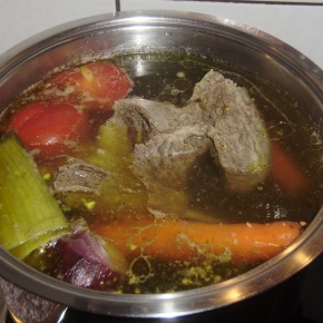Na pol kg do 70 dag mesa daj v juho kakih pet večjih korenčkov, tri do štiri srednje velike korenine peteršilja in malo zelenja, en manjši paradižnik, rezino zelene, eno veliko čebulo, nekaj strokov česna (kar neolupljenih).