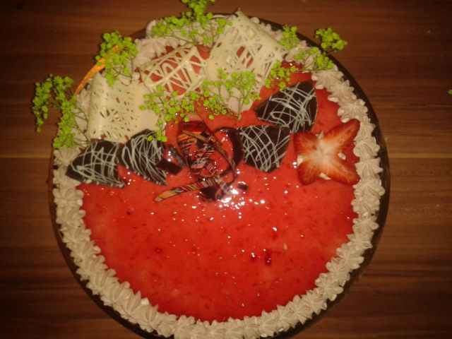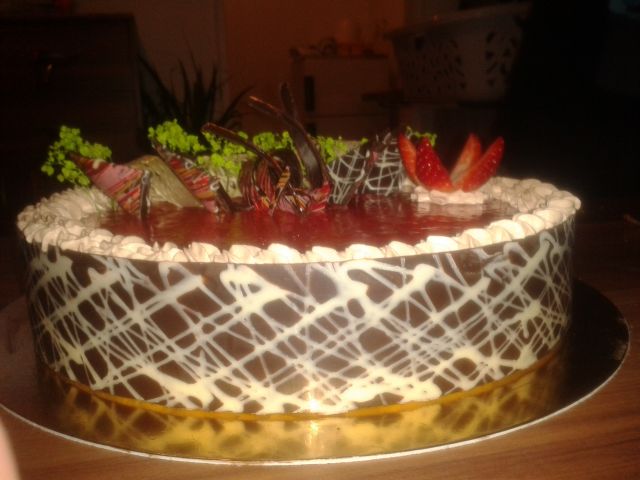 je pa sestavljena iz diska malin,cream brule,vanilijev mousse,ter brownies biskvit,dekoracija je iz čokolade.......