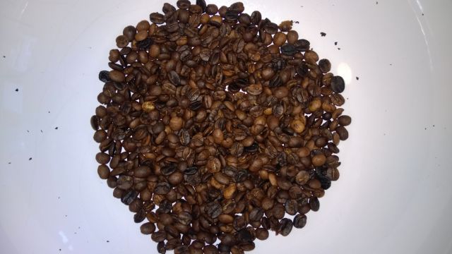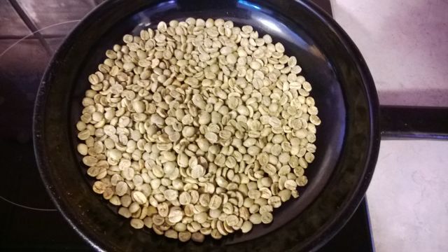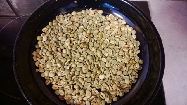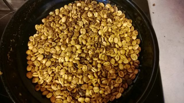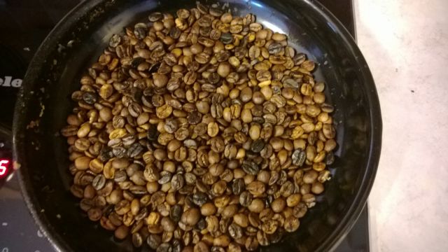 Poskus praženja surove, zelene kave doma je uspel. V ponvi, na srednje visoki temperaturi, ob nenehnem mešanju je bila kava pražena v približno petnajstih minutah. Zanimivo je bilo spremljati kako se spreminja vonj - sprva sploh ni dišalo po kavi, bolj po zažganem senu. Potem se je počasi vonj razvijal in kava je napolnila celo stanovanje. Ko so zrna dobila sprejemljivo barvo, po hitrem ohlajanju in mletju, je šele dobila pravi vonj. Zmleta in skuhana je bila zelo aromatična, nekoliko drugačnega okusa, kot tista kupljena, bolj robustna. Najbrž zaradi nekoliko neenakomerne stopnje praženosti posameznih zrn, kar je posledica praženja v ponvi (kontakt z virom toplote le od spodaj). Naslednja runda bo šla v pečico.