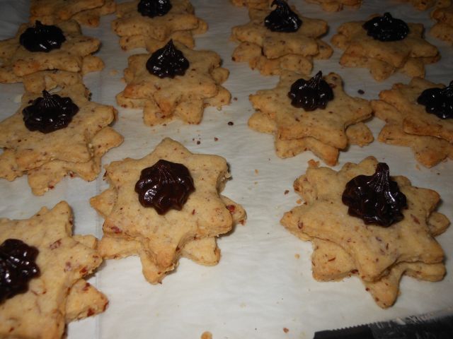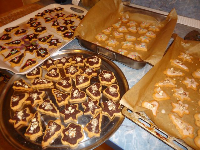 čokoladno-pomarančni piškoti s pomarančno ali čokoladno kremo, moji mehki medenjaki, čokoladno-kokosovi piškoti z belo čokolado, lešnikove zvezdice, cimetove zvezdice, marmeladni srčki-linški, biscottini cocco, rožice z beljakovo kremo, rmove kroglice, ježki