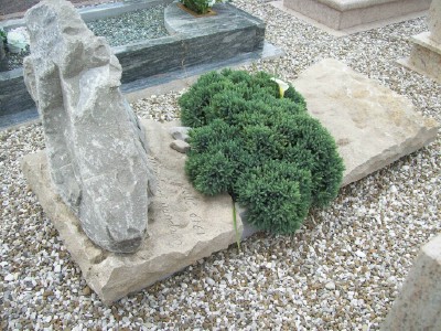 Ker ne spadam med ljudi, ki pogosto obiskujem grob, sem si vse poenostavila. Grob ima eno odprtino, ker je brat menil, da zaprt gorb ne diha, karkoli je pri tem mislil. V sredino sem zasadila ruševje mungo, nizki, počasi rastoči bor. Nekaj rese, ki ji jeseni dodam jesensko reso v izbrani bravi, ki se spomladi nadomesti z drugim cvetjem. Med grmički so razne vrste netreska, ki tudi cvetijo. Prostor je za približno šest cvetočih rastlin. Pozimi so to mačehe Ice baby, ker ne zmrznejo, poleti pa razne nizke.