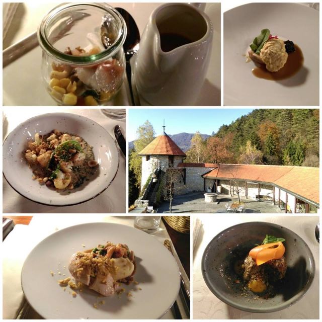 Mi smo v jesenkem tednu bili spet v Štanjelu, gostilna Kobjeglava...ambient, postrežba, hrana..vse top, vse vrhunsko..Za pozdrav iz kuhinje smo dobili eno res gromozansko veliko oljko, vloženo v oljčno olje s kraškimi zelišči,in ščep cvetne soli...zraven domač kruh, da si "potočal" olje..Nato je bila rahlo pikantna hruškova juha s peno staranega sira Jamar ( ta sir se stara globoko pod zemljo, v kraški jami ) in posipom iz drobno seseklejanih ocvirkov iz uhlja (prvič jedla ocvirke iz uhlja..hudo dobri so..sedaj iščemo ričeto, ko bomo imeli koline)..sledila je kremna rižota s kostanji, staranim sirom in popečeno panceto...za glavno jed pa telečja krača, kuhane na počasi, potem razkoščičena, začinjena in kot v enem kalupu stisnjena ter povaljane v zelišni panadi..zraven pa šalotka, janež, prelita s krasno omako, malo pireja in gobov ketcap.Sladica pa bučni sladoled, mislim da na enih ajdovih hrustavčkih, v sladoledu pa še nalistana buča in "pokrit" z medeno-ajdovim krokantom..
