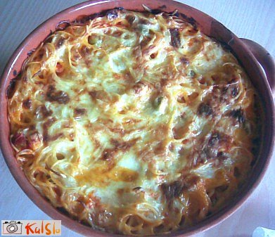 Evo ena stara fotka gratiniranih testenin v enem od mojih glinastih, znotraj glaziranih pekačev: