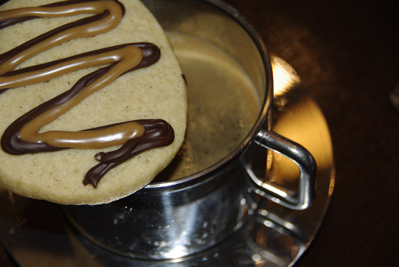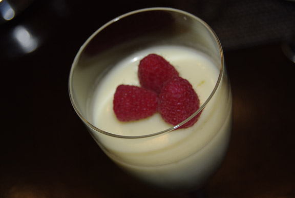 Posset z malinami in piškot odišavljen s kardamomom ter "porisan" s čokolado in espresso glazuro.