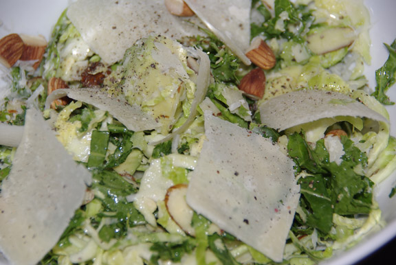 Solata iz kale in brstičnega ohrovta v vinaigrette z avokadom in mandelji ter naribanim parmezanom