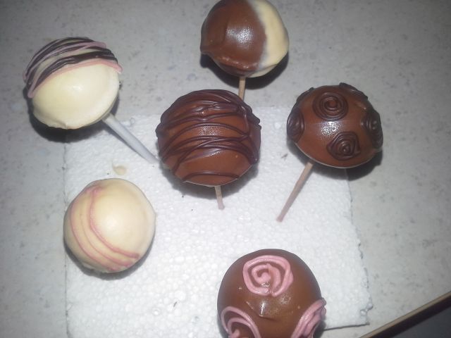 sajovict, če bi jih do pogostitve imela v hladilni torbi - mogoče. Ampak, ker so palčke namočene v čokolado in nato so nataknjeni gor cake pops, nisem popolnoma prepričana, da bi bilo v redu. Jih pa lahko ponudiš obrnjene, tako da so palčke obrnjene navzgor, kroglice pa so v papirnati košarici. Za ta način serviranja, vzameš najkrajše palčke. Lahko ponudiš tudi pecivo "cesarjeve oči", je zelo dekorativno. Jih lahko napraviš dosti prej in jih imaš do takrat v zamrzovalniku. Lahko pomočiš grozdje v čokolado in serviraš v papirnatih košaricah. Pa še bi se kaj našlo. Lepo servirano skupaj z različnimi piškoti, bi bilo kar v redu.
