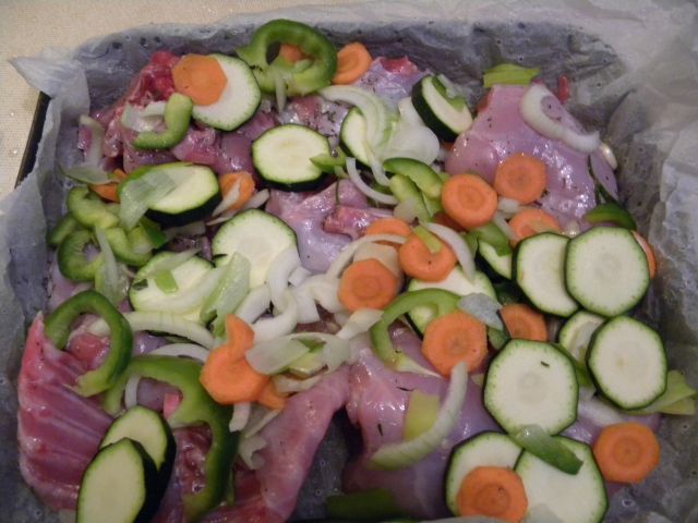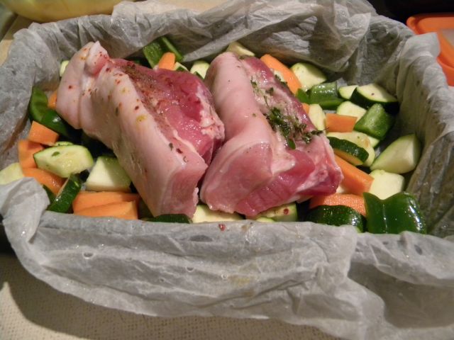 Še moj nasvet......jaz meso natrem z soljo, poprom,česnom,timjan,rožmarin,majeron,malo olivnega olja in pustim počivat.....pripravim zelenjavo:korenček,bučke,papriko.......pripravim pekač in peki papir....peki papir odrežem na dvojno mero pekača in ga zmočim pod vodo ,da se zmehča kot cunja........položim v pekač,nasujem zelenjavo meso,največkrat so to sv.rebrca in pokrijem z peki papirjem kot pismo........vse roma v pečico,za eno uro......občasno preverim stanje zelenjave in jo po potrebi odstranim........na koncu odprem papir in zapečem.....tako dobim okusno meso,prilogo in aromatično omako.