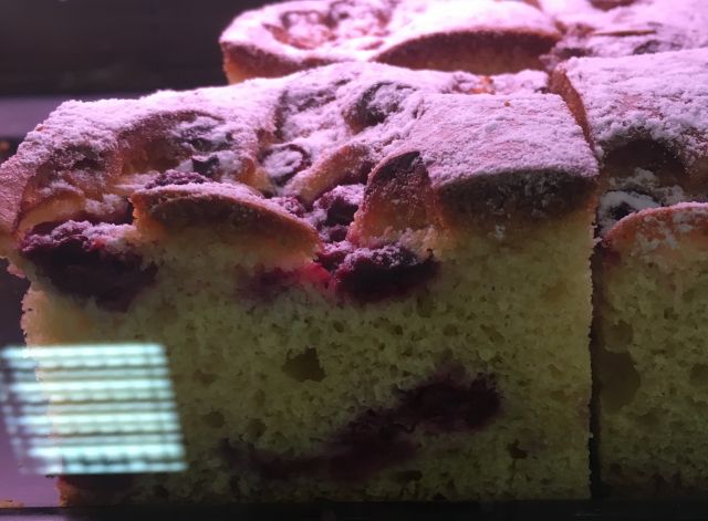 Verjetno gre za kolač iz umešanega testa (tj. maslo umešano z mletim sladkorjem) ali za biskvit, kjer so cela jajca ali ločeni rumenjaki umešani s sladkorjem, temu pa je nato dodano olje ter mleko ali kaka druga tekočina ter pecilni prašek, kateremu je na koncu dodano sadje. Lahko da gre tudi za biskvit brez maščobe, ampak manj verjetno, sodeč po 'gostoti' kolača na sliki...
