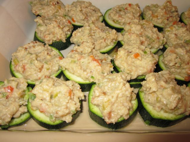 V bistvu včeraj za kosilo: pečene bučke, obložene z maso iz namočenih ovsenih kosmičev (dodana popražena čebula in paprika), prelito z pirino smetano in jajčkom. Par jih je bilo obloženih s sirčkom (pa ne zame). Zraven motovilc.