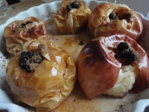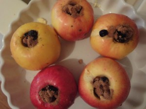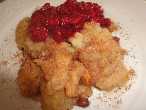 na nekaj kapljicah vode sem prepražila narezana domača jabolka - bobovec , dodala sem dve žlici rozin, cimet in nekaj madeljev. V drugi kozici sem prepražila zamrznjene maline le toliko, da so se malo podušile. Rezultat je tu in moram priznati, da je zelo dobro bilo.