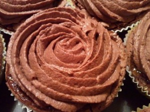 Ko se je ohladilo sem malenkost stepla in nabrizgala. Veliko lepše se je brizgala tista, ki je bila stepena le čisto malo, da se je samo dobro premešala. Robovi so bolj gladki. Ko se krema strdi, pa je dosti trda, tako da tudi iz postrani ležečega muffina nikakor ni dol spolzela (to sem poskusila zarad cupcake bouqueta ;) ). je trda tako, da se ne pozna niti prstni odtis. Fantu je imela dober okus tudi z bananino aromo, sestri pa z mentolovo. Meni je najbolj dobra s pomarančno lupino ali pa brez vsega.