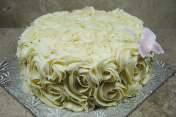 Uuuuu, so lepe tele torte! Jst bi kremo prej stepla. Po mojem maslo precej pripomore k trdnosti kreme - ne maram buttercream zadev, ampak pri tej torti bo težka samo z ganašem. Jst bi spodaj torto premazala z ganašem, počakala da se malo strdi, a ne preveč - toliko, da bi lahko služil kot baza, na katero bi se nabrizgane vrtnice "oprle".