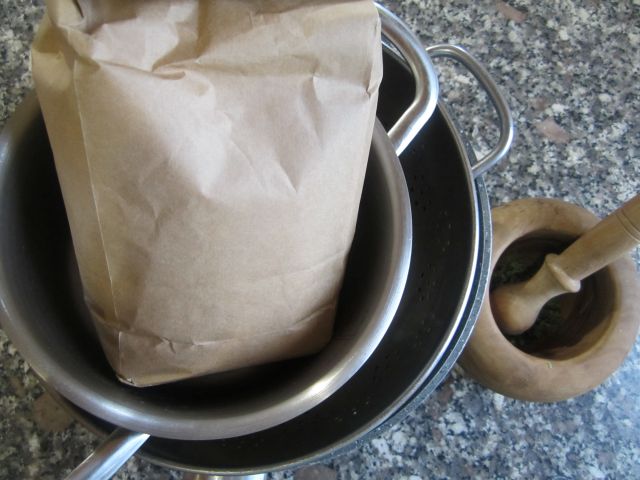 Mogoče je res malo slabo slikano ..med dvema kozicama je cedilo, v njej jed.V zgornji kozici pa je vrečka moke kot utež.Dokaj znana je, jaz sem v njo dala še namočena zelišča.