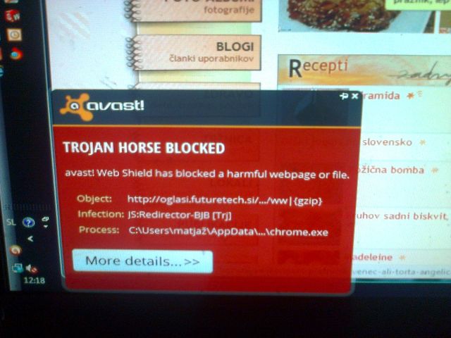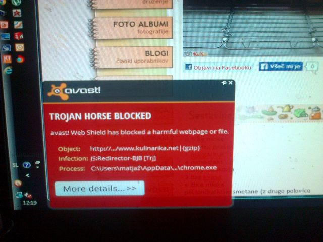 Tudi meni javlja, da je najden trojanski konj, na katerokoli stran Kulinarike grem. Pod ime datoteke piše: http://oglasi.futuretech.si/www/delivery/spc.php?zones=co . Če to kaj pomaga....