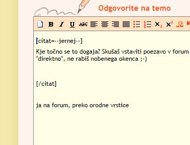 Aja, Jernej, pozabila sem povedati, da uporabljam brskalnik chrome na win 8.1 in sem na to težavo prvič naletela sinoči, prej mi na kulinariki "direktno linkanje" in tudi običajno lepljenje linkov v tekst, nikoli ni povzročalo teh težav.