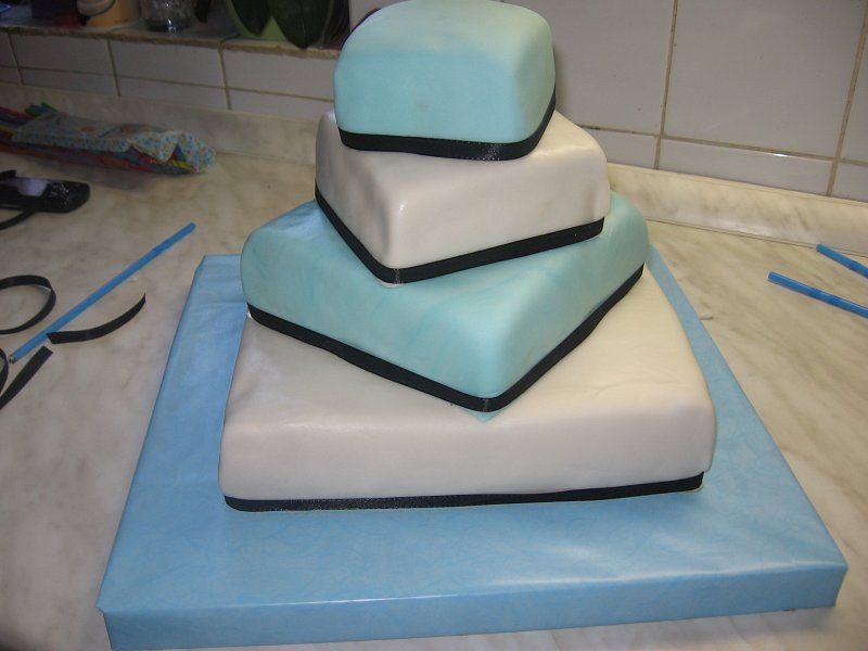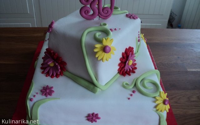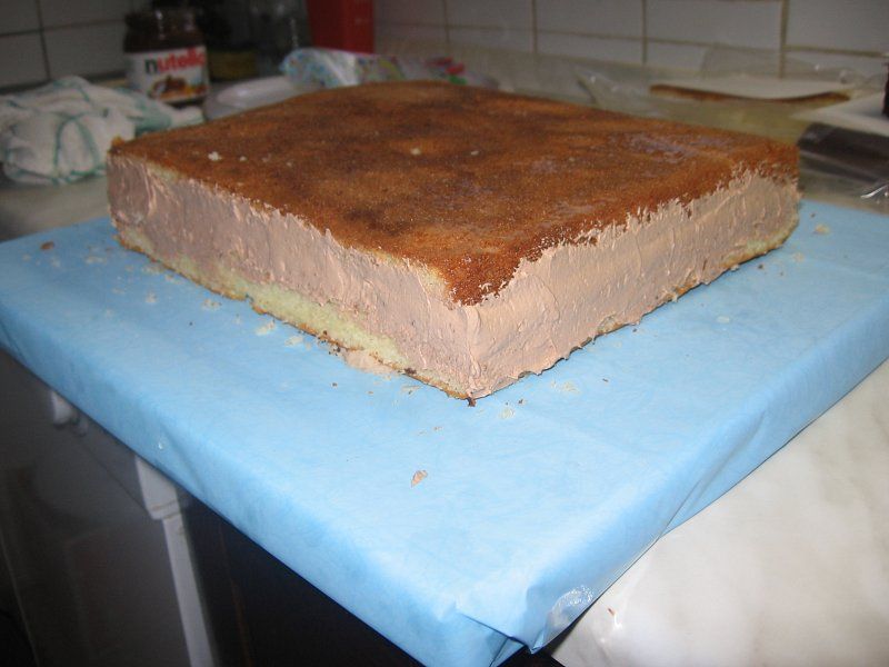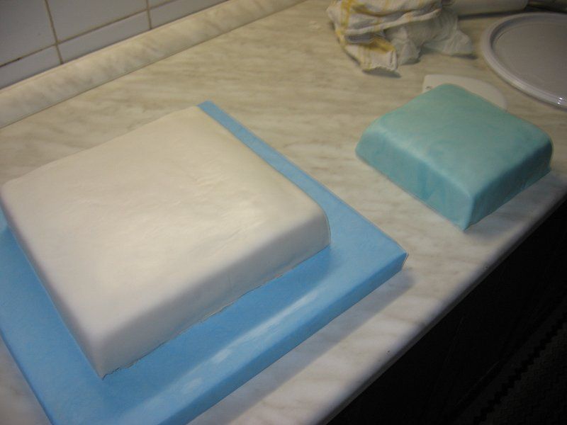 Torta je oblečena v tičino in pripravljena za nadaljno dekoracijo.
