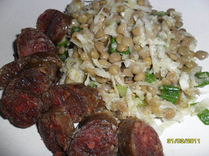 domače klobase,leča,mlad.čebula,črna redkev v solati