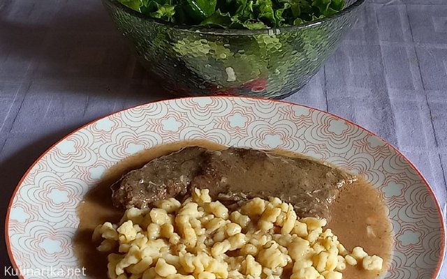 Goveji zrezek v naravni omaki, špecli; zelena solata s paradižnikom in mlado če