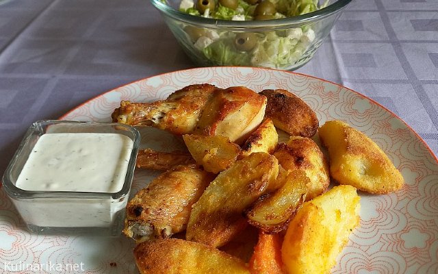 Pečene perutničke s krompirjem, koprov zos; zeljnata solata s feto in olivami