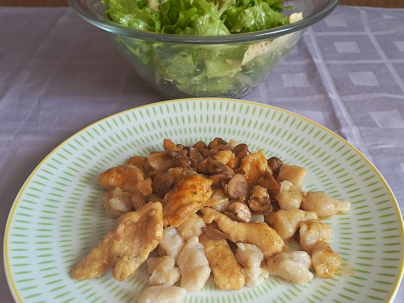 Piščančji trakci s šampinjoni, ščipanci; zelena solata
