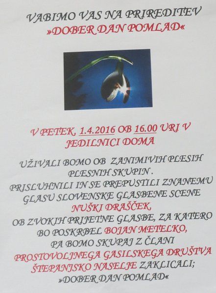 Danes smo imeli čisto posebno prireditev - poimenovano Dober dan pomlad. Začeli
