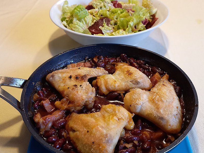 Zapečen fižol, perutničke; solata z rdečo peso