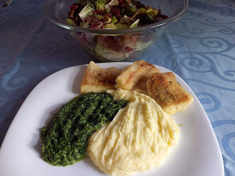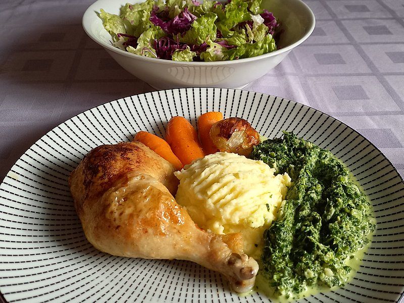 Pire krompir, špinača, pečeno pišč. bedro