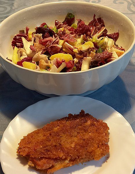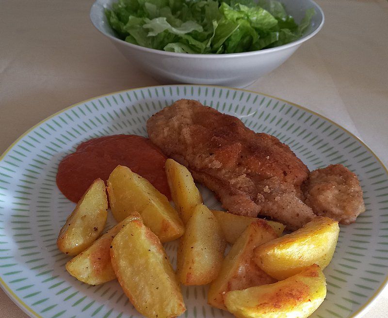 Paniran sv.zrezek, pečen krompir, paradižnikov zos; zelena solata