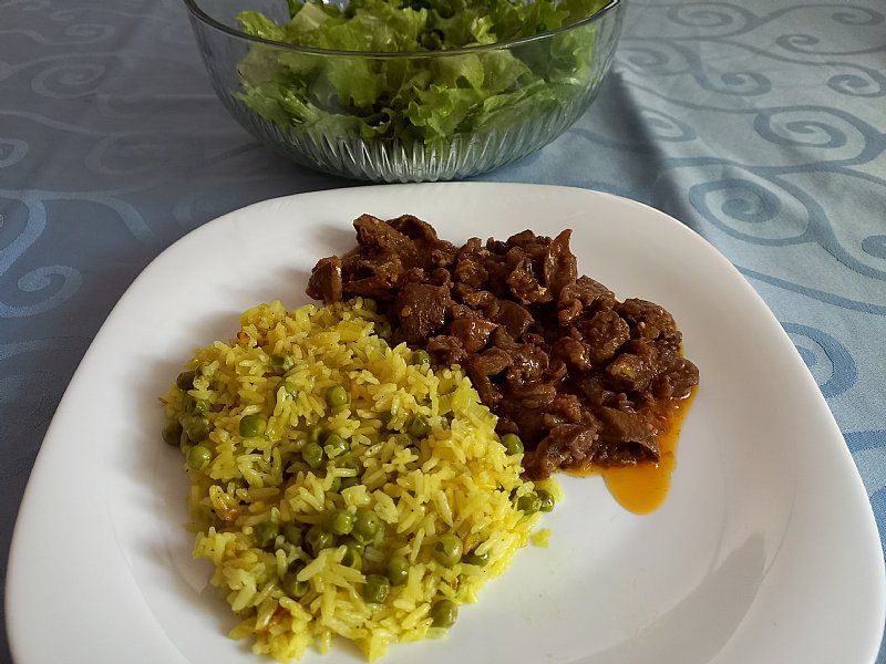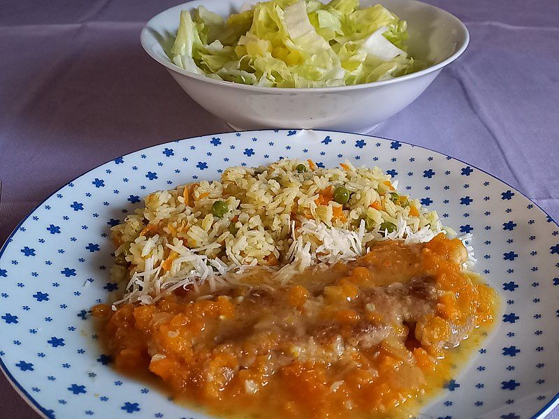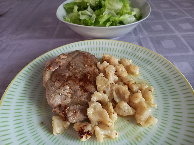 Rizi-bizi, sv.zrezek v omaki; štrucar s krompirjem