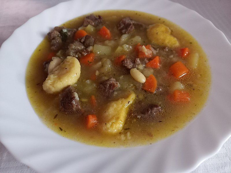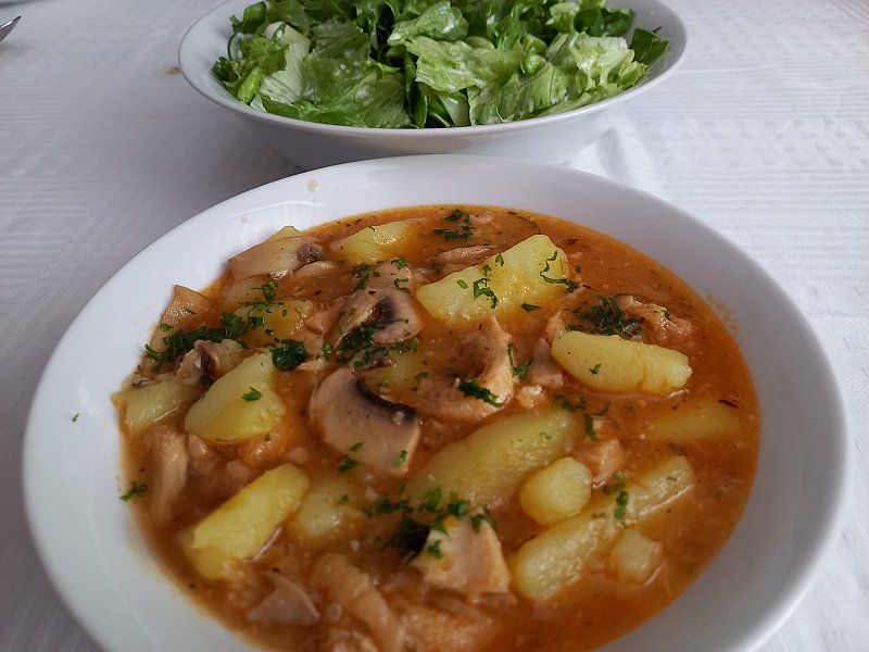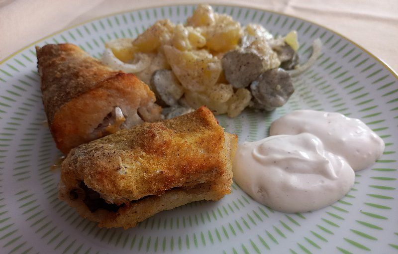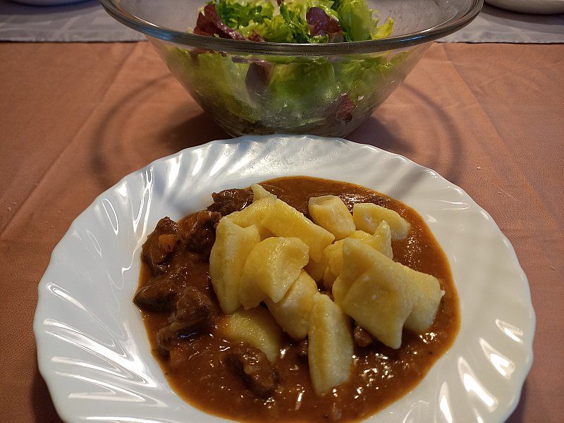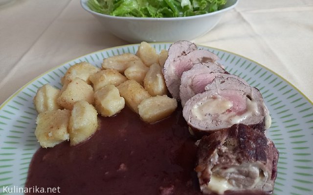 Sv.file nadevan s sirom, v črnem vinu, njoki; zelena solata