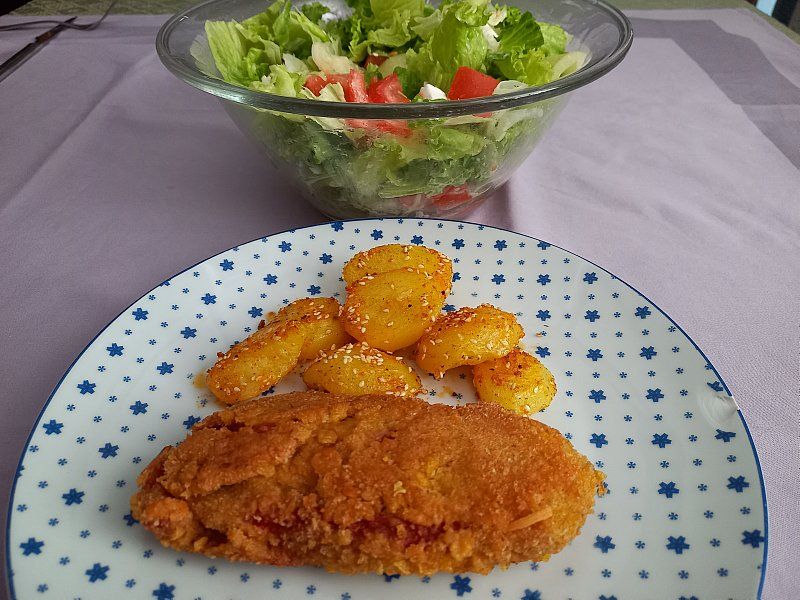 Panirani zrezki, malancani, pečen krompir; zeljnata solata; paradižnik papri