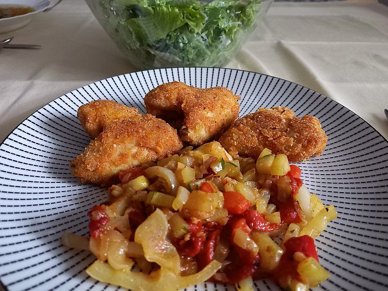 Panirane perutničke, bučke in paprika iz voka; zelena solata